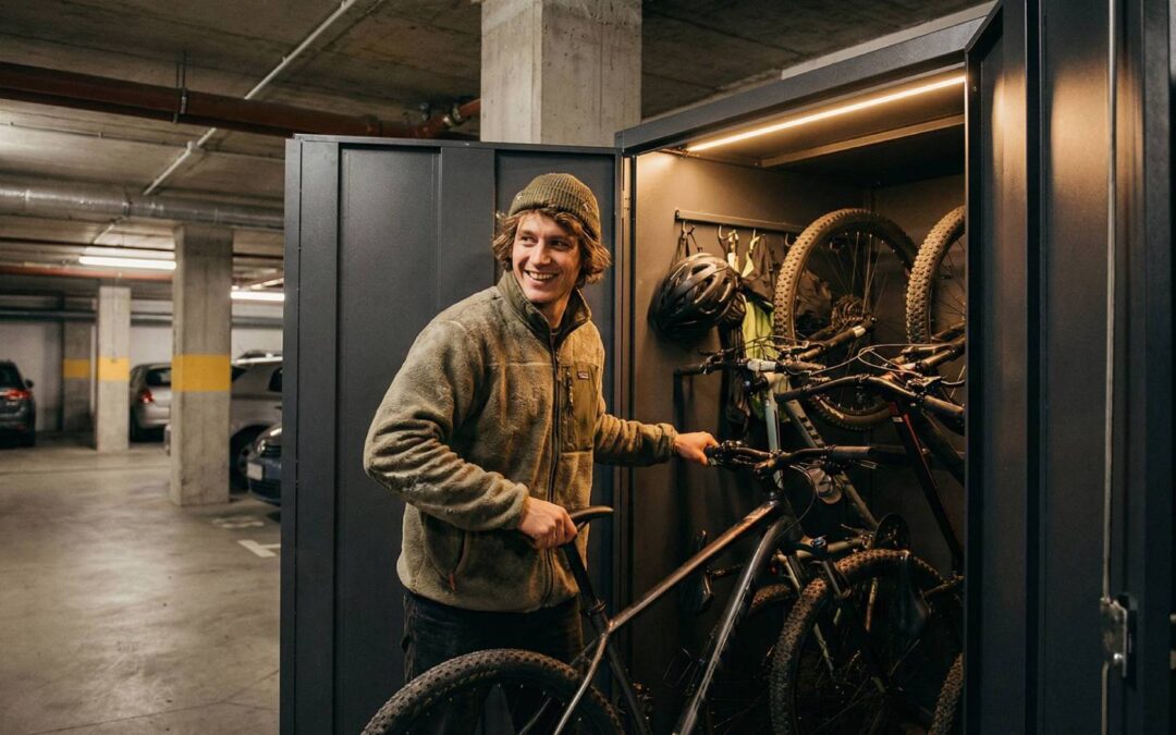 Zabudowa w formie metalowej szafy lub boksu tworzy wydzieloną strefę przy miejscu postojowym. Rower można zawiesić na uchwycie wewnątrz konstrukcji, opony ustawić pionowo na dedykowanej półce, kaski i akcesoria schować do zamykanej części. Sprzęt nie styka się z samochodem sąsiada ani nie blokuje ciągów komunikacyjnych.