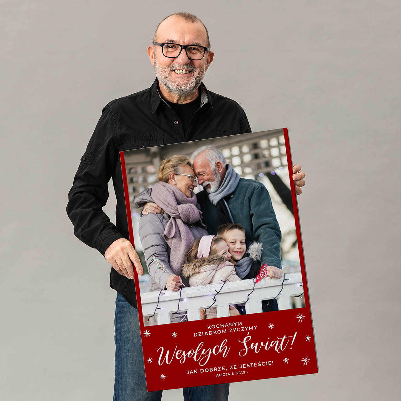 Szukasz czegoś szczególnego jako prezent dla dziadka na święta? Duża kartka świąteczna to klasyka w nowoczesnym wydaniu. Personalizowana, efektowna i pełna ciepłych życzeń – z pewnością wzruszy każdego dziadka i babcię. Można ją postawić w widocznym miejscu, by cieszyła dziadków przez cały grudzień.
